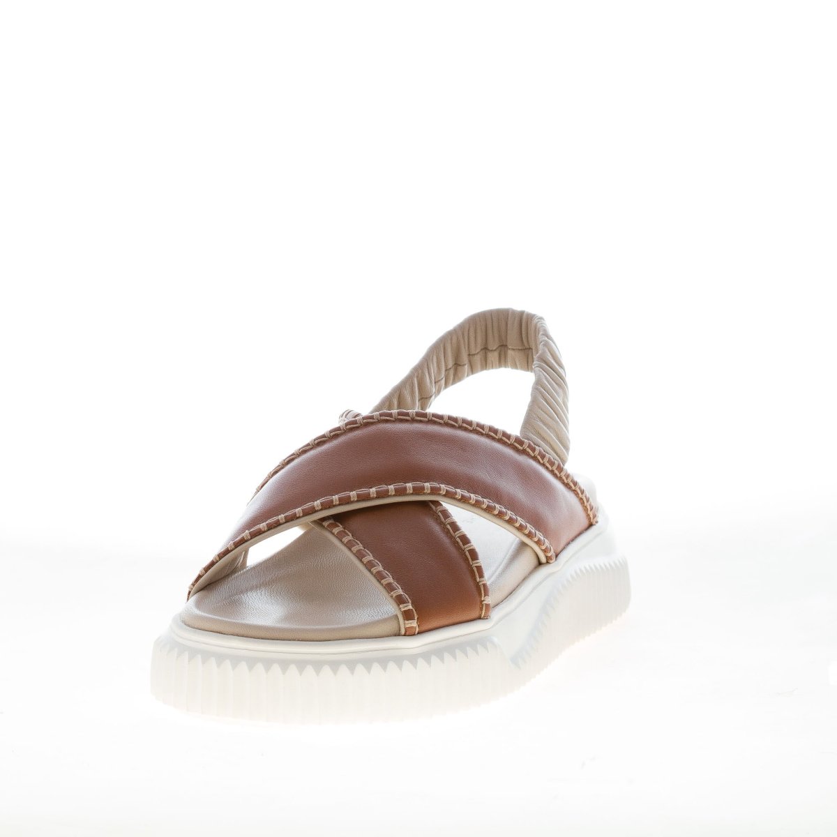 Sandalo sportivo Swami realizzato in pelle marrone con design a doppia fascia incrociata sul piede e chiusura posteriore con cinturino elasticizzato beige.ย Cuciture in rilievo sulle fasce. Suola in gomma con profilo zigrinato con altezza di circa 4,5 cm