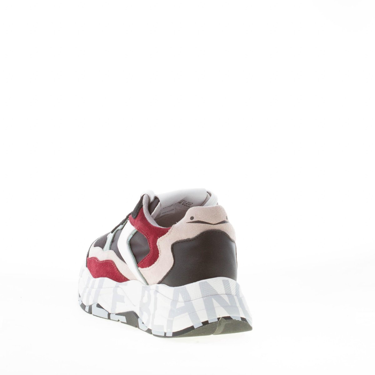Club107 panelled sneaker featuring a mix of black leather and nylon fabric with beige and bordeaux suede panels and white leather slash detail. White ultralight platform-effect rubber sole with custom silk-screened printing