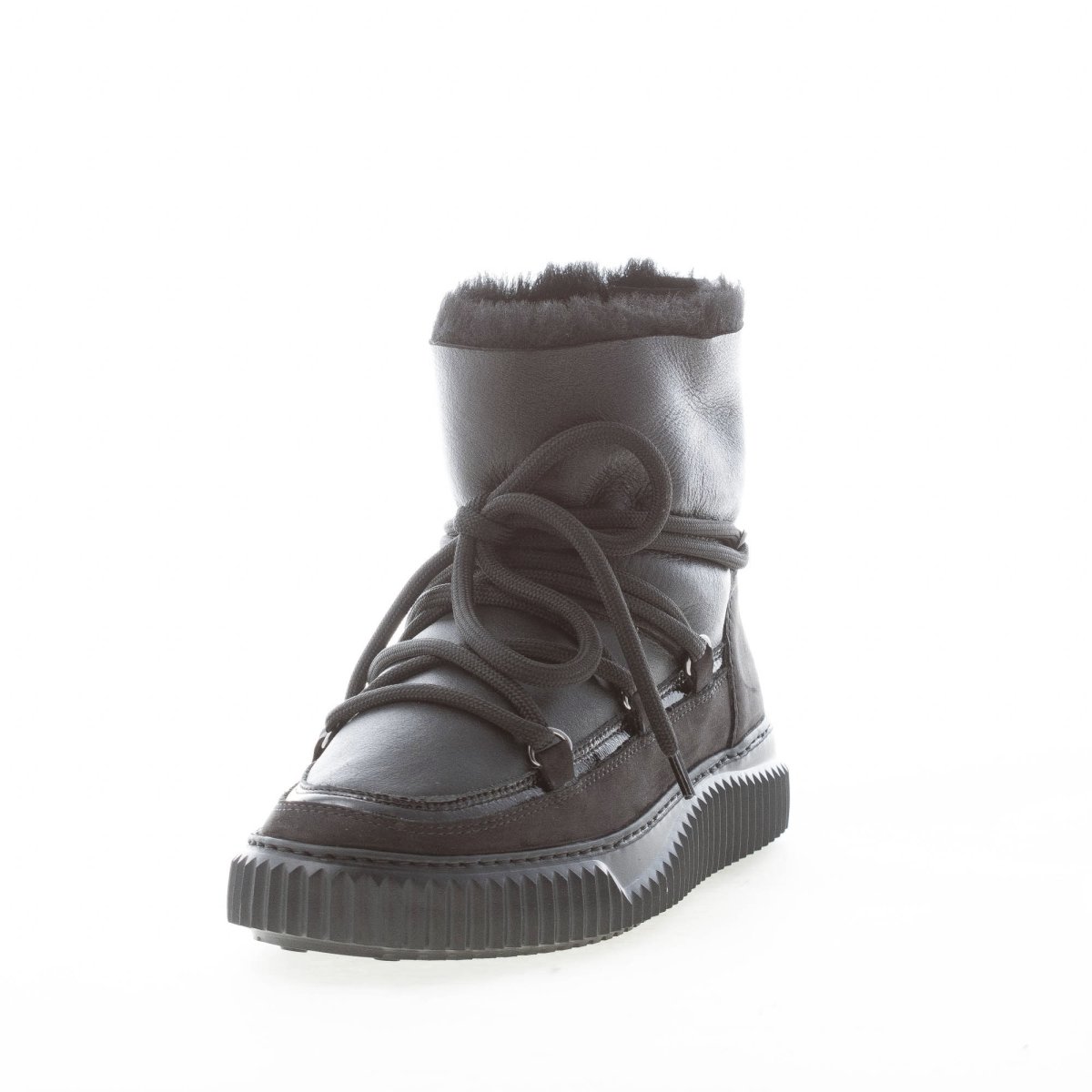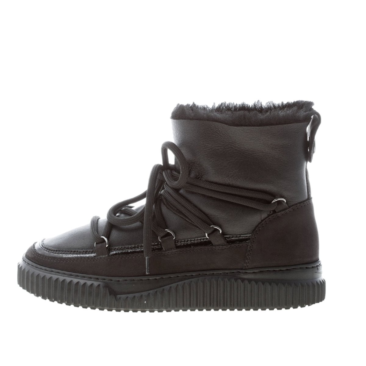 Black leather and nubuk Cortina ankle boot with sheepskin lining. Glamour details with patent leather inserts and skiboot style laces. Lightweight rubber sole with serrated edge embellishment