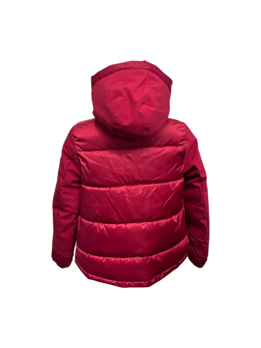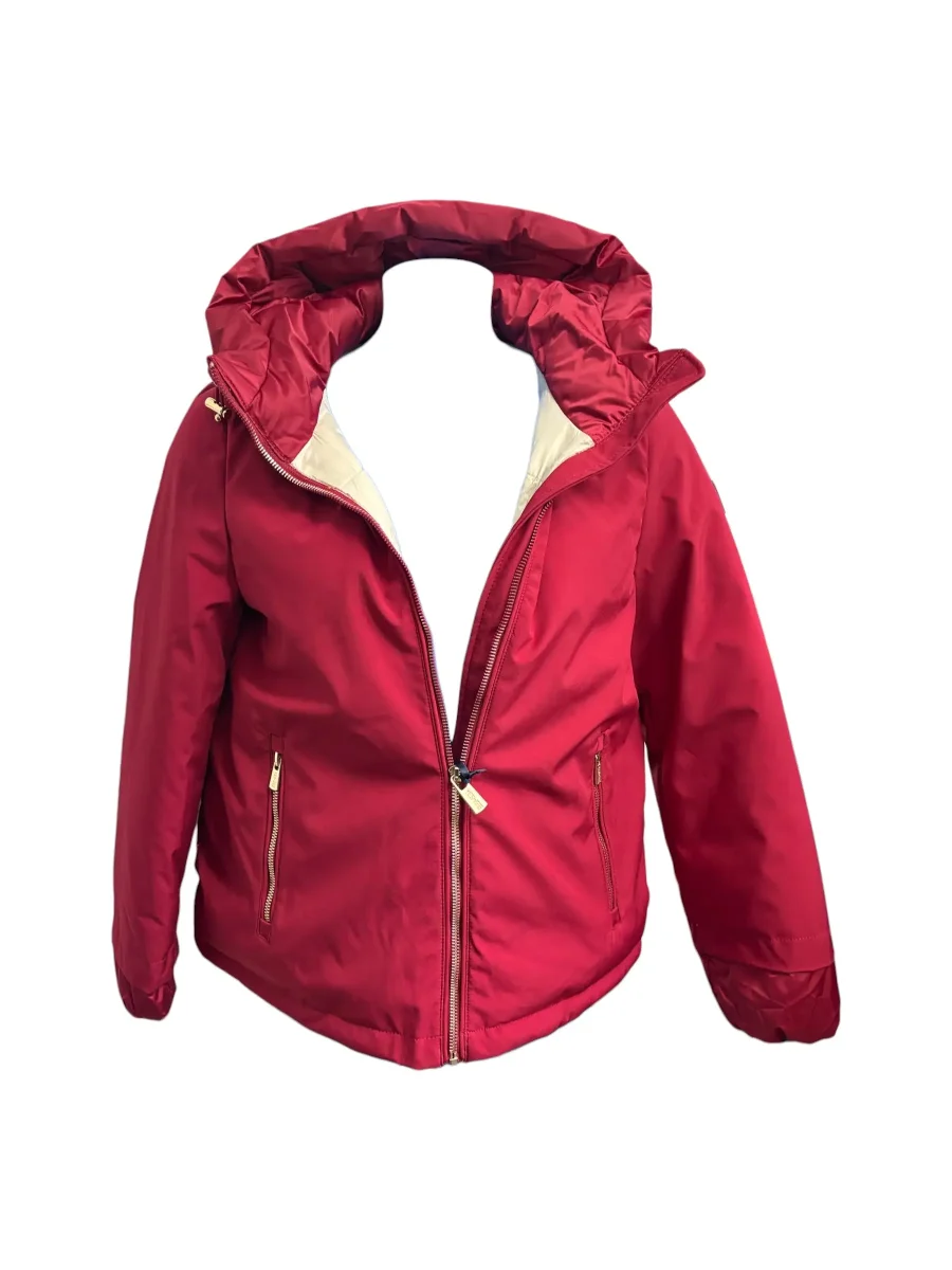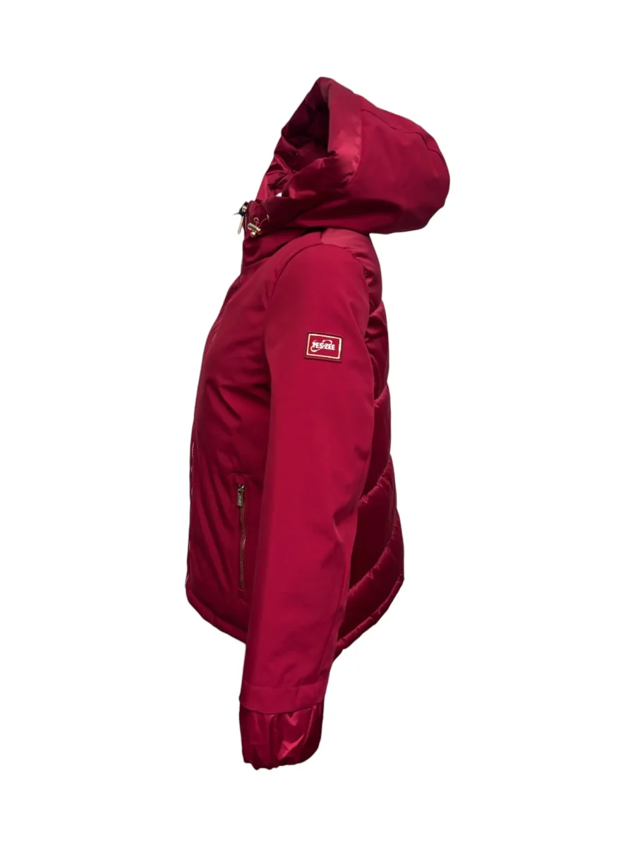 Giubbino rosso rubino da donna con cappuccio. Un capo versatile che unisce un’estetica sportiva a dettagli raffinati, ideale per le stagioni fredde. ย La cerniera centrale con doppio cursore e le cerniere delle tasche sono in metallo dorato, creando un contrasto elegante con il tessuto rosso. Il retro della giacca รจ caratterizzato da unaย trapuntatura a fasce orizzontali.