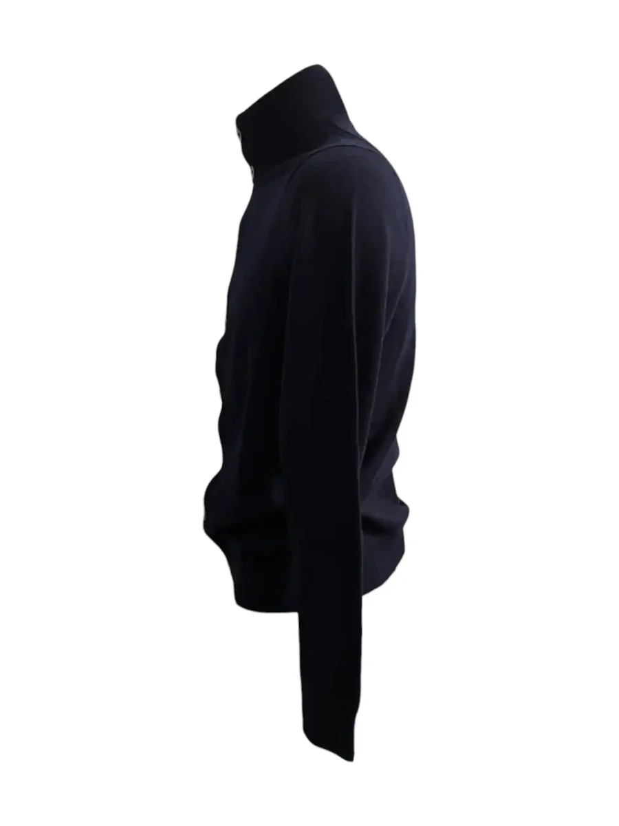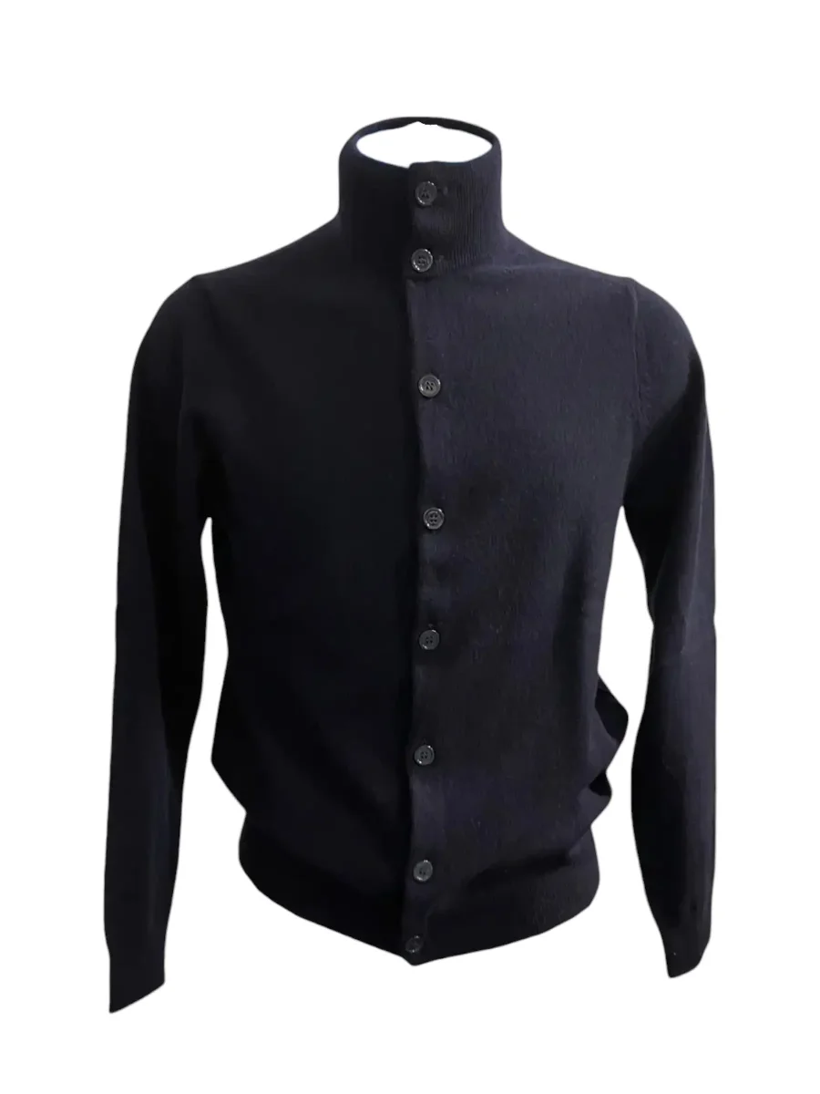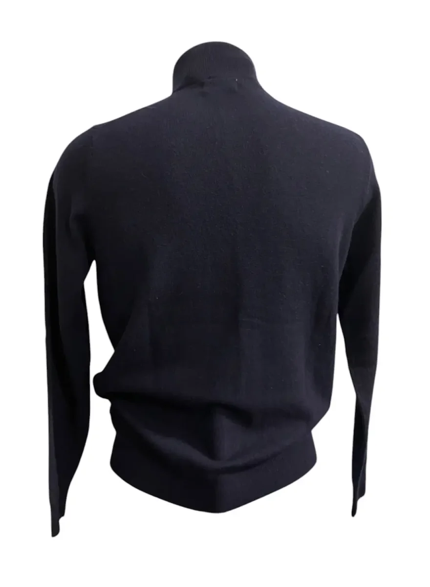 Cardigan a lupetto con bottoni realizzato in 70% lana e 30% cashmere colore blu scuro. In ogni caso rispondiamo volentieri alle domande riguardo le misure.
