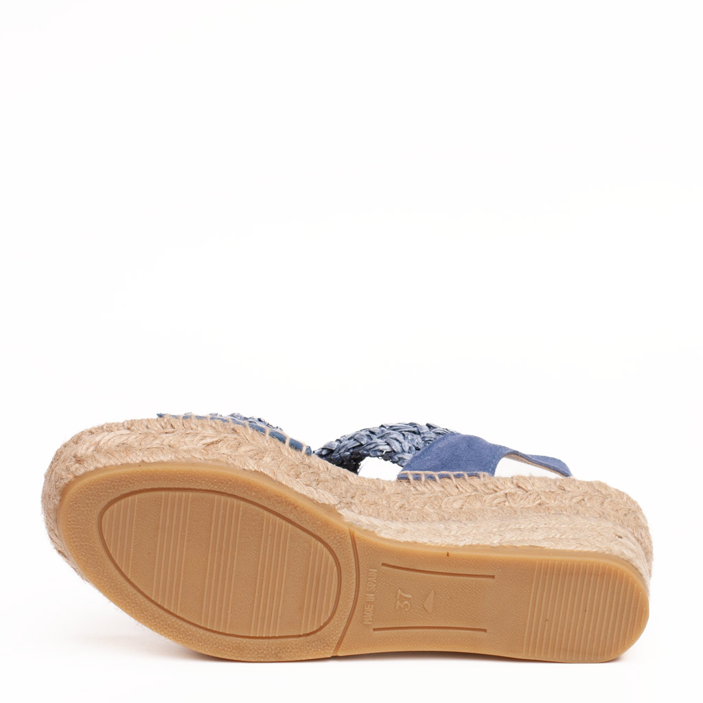 Sandalo con zeppa in corda e tomaia in camoscio e rafia. Si infila. Fodera in pelle. Suola in gomma. Altezza tacco 7 cm, plateau 4 cm. Made in Spain.