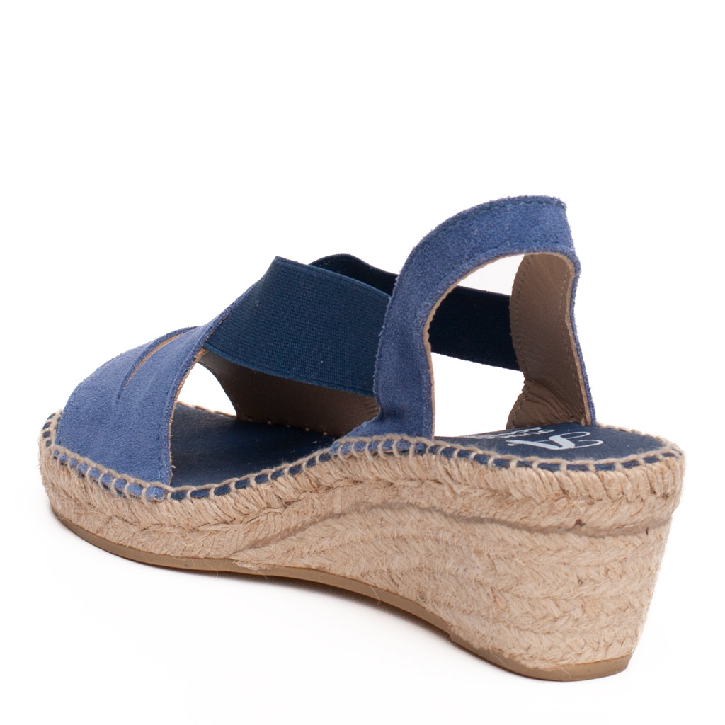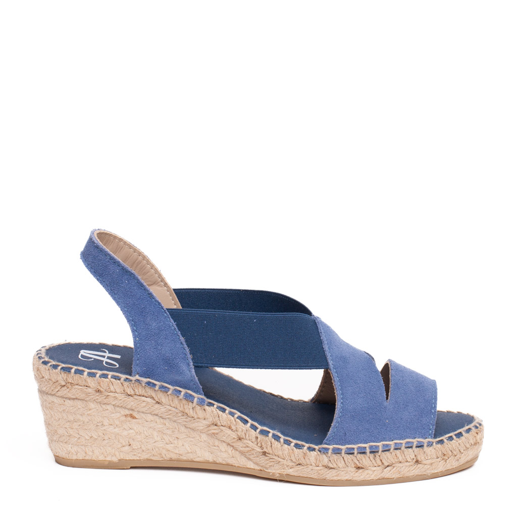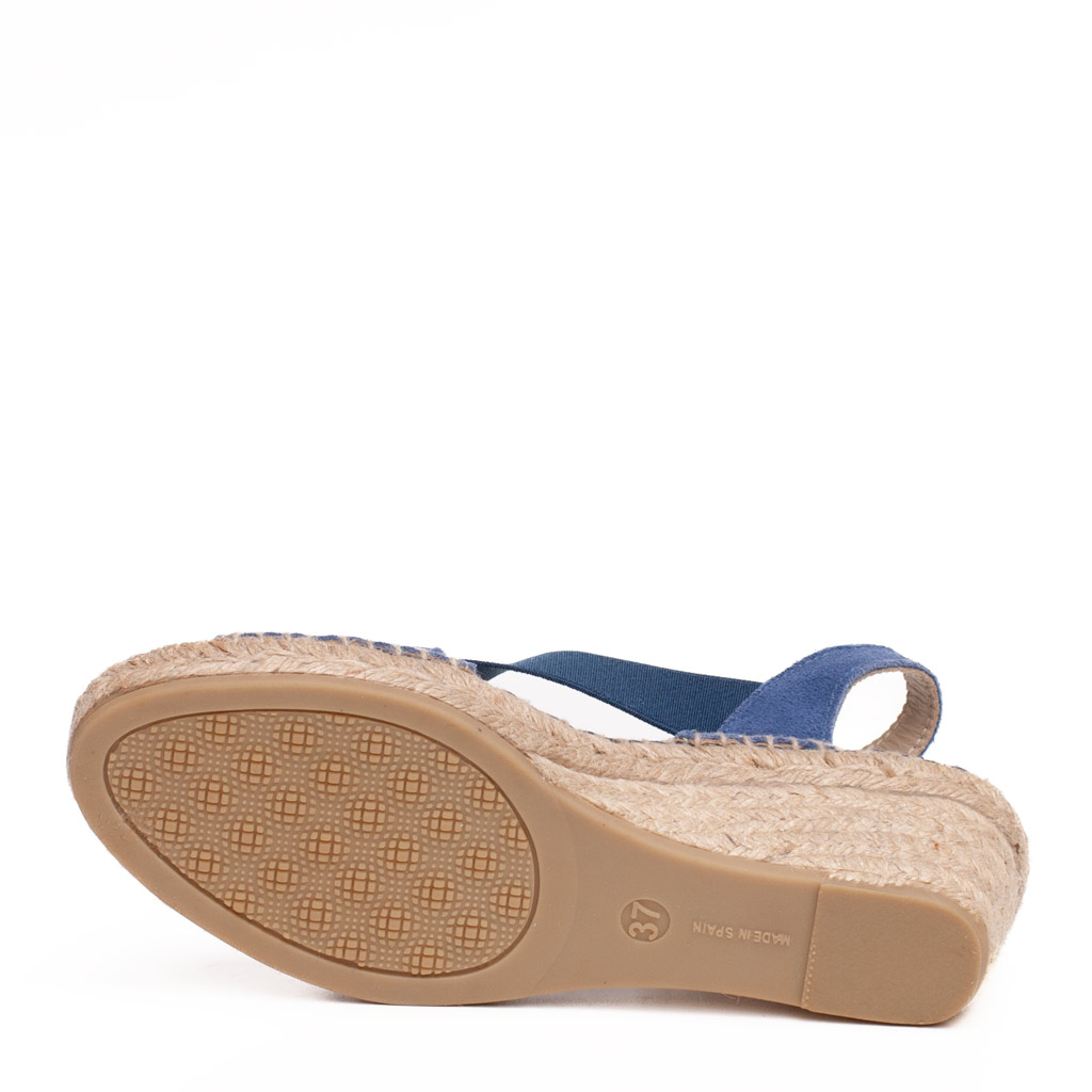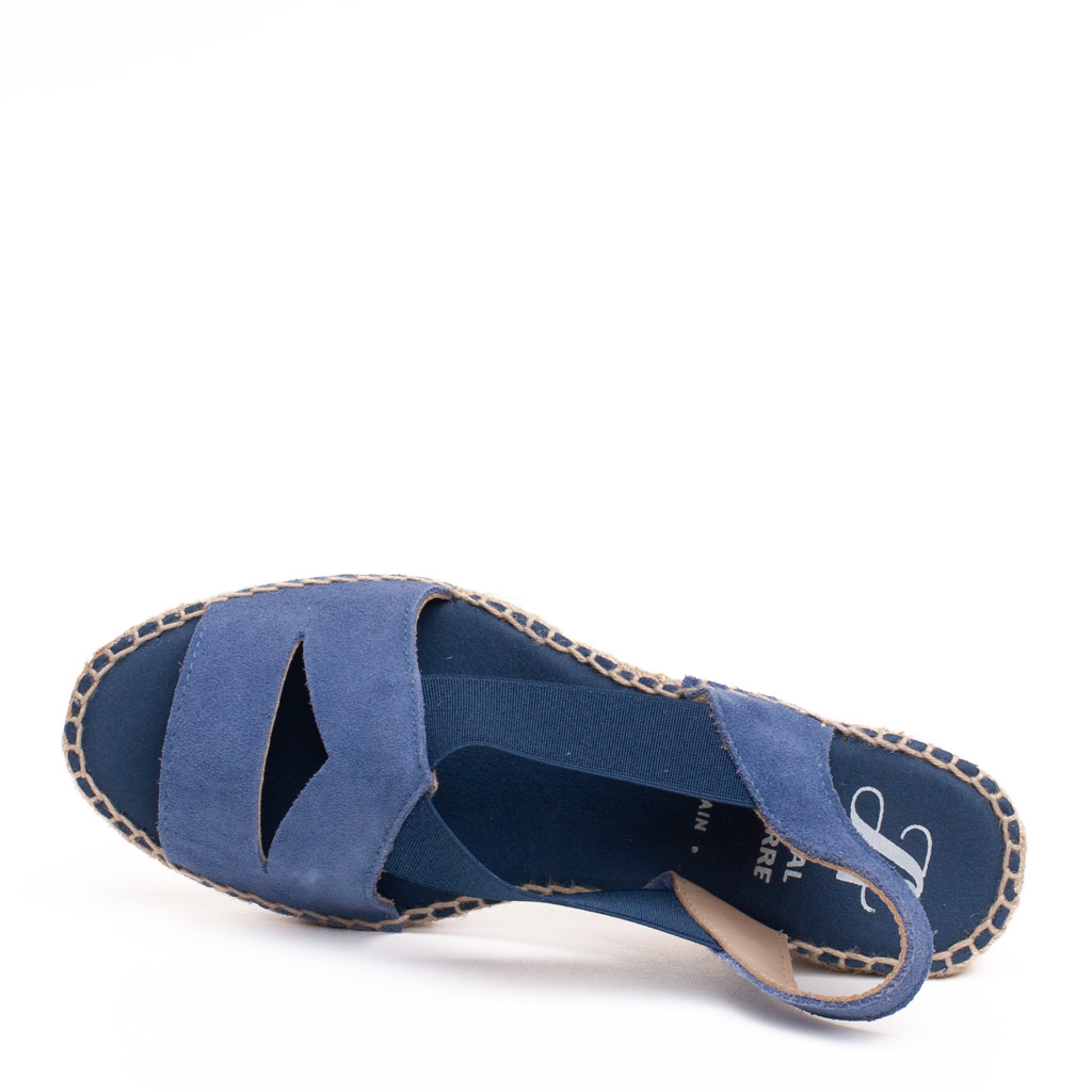 Sandalo con zeppa in corda con tomaia in camoscio azzurro. Fodera in pelle. Suola in gomma. Altezza tacco 5 cm, plateau 3 cm. Made in Spain.